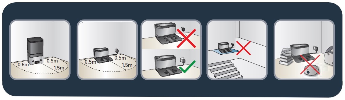 To mesto mora biti oslobođeno svih prepreka (uključujući tepihe). Ostavite najmanje 1,5 m praznog prostora sa leve i sa desne strane i 2 m ispred baze. Ukoliko ste bazu stavili u ugao ili ju je teško pronaći, robot usisivač neće moći da dođe do nje.